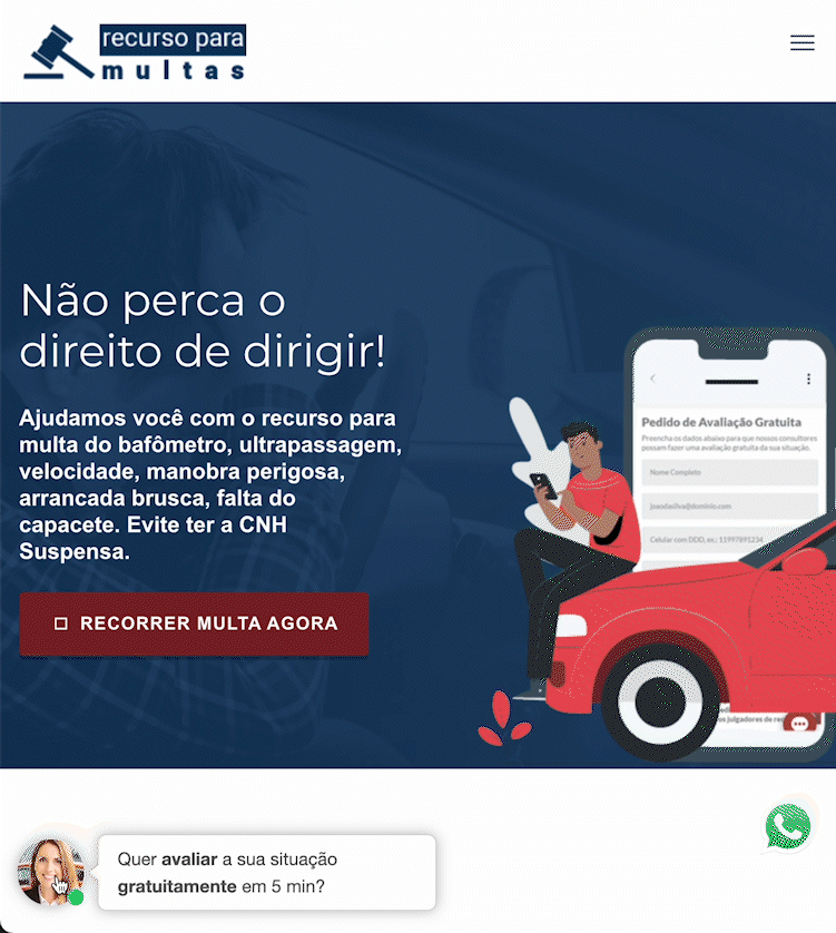 Já na página inicial, a chamada utiliza um gatilho mental da confiança, afirmando que a situação será avaliada gratuitamente em 5 minutos e, a partir de uma conversa mais abrangente, é possível entender a necessidade de cada lead.