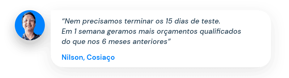 De 2021 pra cá, a Empresa Cosiaço já aumentou em 4 vezes o número de orçamentos qualificados enviados para a equipe de vendas. Graças aos filtros configurados na ferramenta, a abordagem dos vendedores se tornou muito mais rápida e assertiva - o que resultou em um aumento de 40% nas vendas.